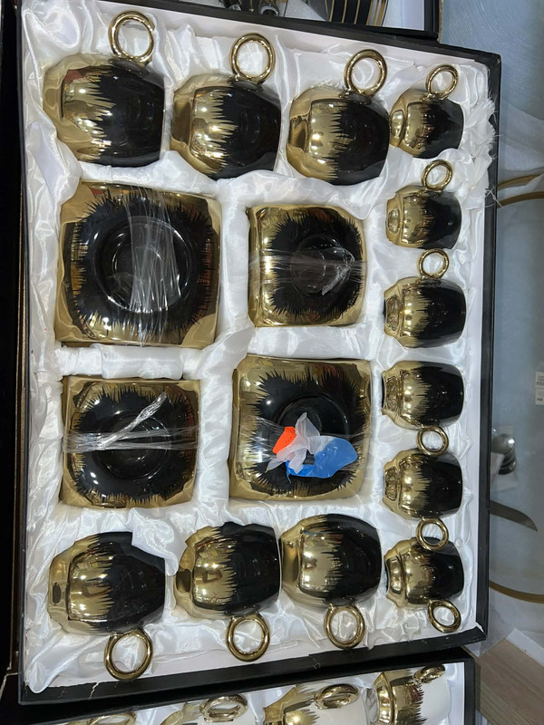 هذا المنتج عبارة عن طقم فاخر لتقديم القهوة أو الشاي، ويتكوّن من كوبين صغيرين مع صحنين متناسقين: • الأكواب مصنوعة من بورسلان أبيض راقٍ مزخرف بنقوش نباتية جميلة بلمسات ذهبية أنيقة