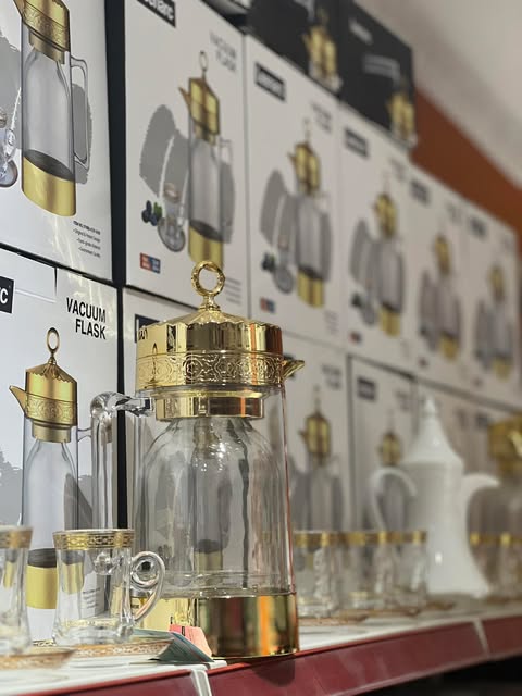 لمنتج في الصورة هو إبريق فاخر لحفظ المشروبات الساخنة (Vacuum Flask) مصنوع من الزجاج الشفاف مع لمسات مذهبة أنيقة.