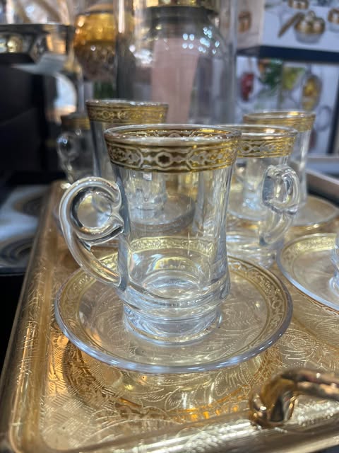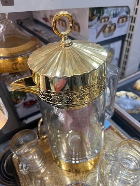 أتي معه طقم أكواب شفافة مزينة بحواف ذهبية متناسقة مع تصميم الإبريق
